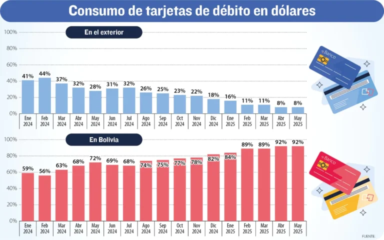 Desde 2024, el consumo con tarjetas de débito en dólares fue bajando paulatinamente. En enero del año pasado era de un 41% en el exterior y de 59% en el país; sin embargo, a mayo de 2025, las operaciones con estos medios de pago en Bolivia subieron al 92% y en el exterior bajaron al 8% debido a las restricciones.