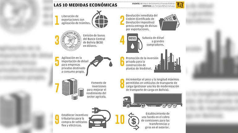 La octava medida plantea incrementar el peso y la longitud de máximos permitidos en vehículos de transporte de carga, para ello, se gestionará una ley de modernización de transporte de carga en Bolivia.