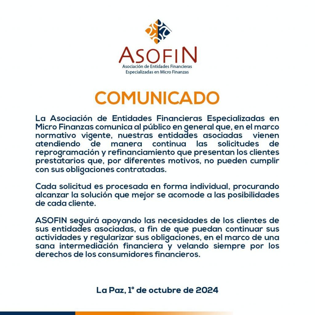 Bienvenido a la Página Web de ASOFIN, Asociación representativa del sector de microfinanzas boliviano.